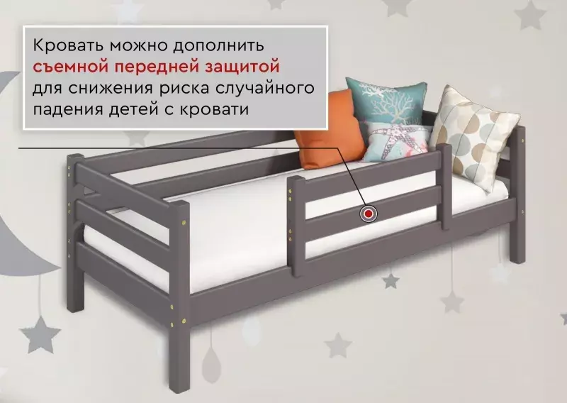 Кровать можно дополнить съемной передней защитой (пакет №5) для снижения риска случайного падения детей с кровати. Матрас и выдвижные ящики приобретаются отдельно.