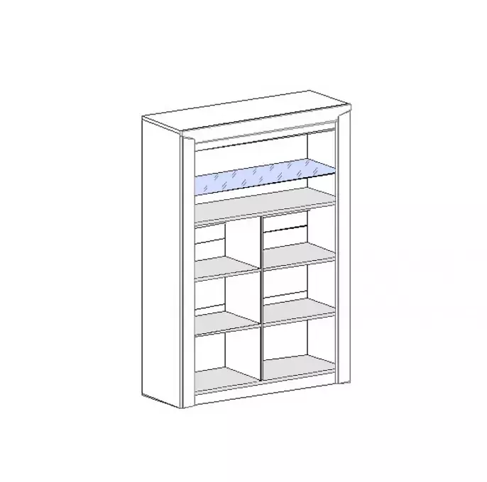 Внутри несъемная полка усиливает жесткость шкафа. Над стационарной полкой устанавливаются одна съемная стеклянная полка, из прозрачного стекла толщиной 5 мм, а в двух нижних отделениях устанавливаются четыре щитовые полки. Внутреннее пространство шкафа закрыто двумя составными дверями, имеющими по одной стеклянной вставке в верхней части.