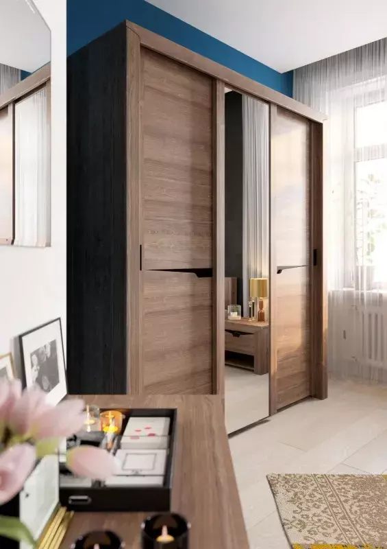 На центральной двери наклеено зеркало, по бокам от которого закреплены две декоративные планки из МДФ. Боковые двери имеют составную конструкцию с декоративным вырезом и одной боковой планкой с установленной на ней ручкой.