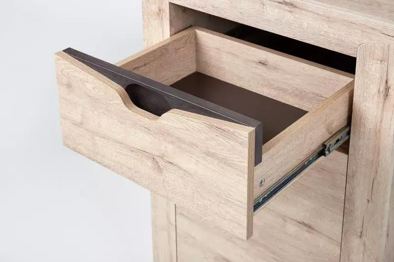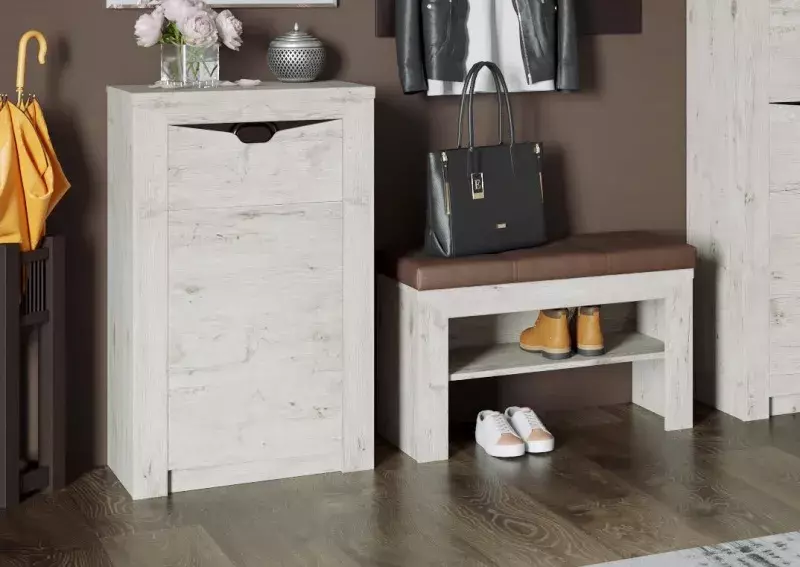 Тумба имеет распашную дверцу, за которой скрывается достаточно места для хранения обуви, а выдвижной ящик идеально подходит для хранения мелких предметов, таких как ключи, перчатки и шапки. Для открывания двери внутри устанавливается система Push to open открывающая ее после нажатия. На открытой полке можно разместить аксессуары или декор, чтобы добавить индивидуальности прихожей.