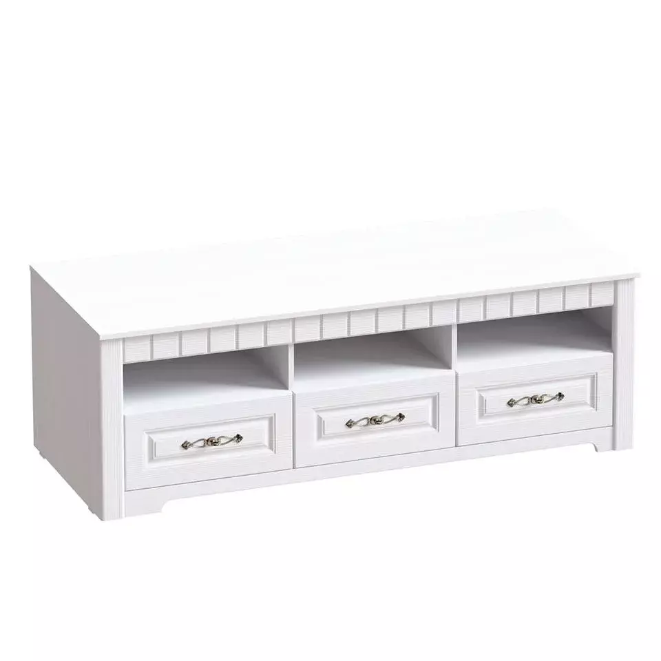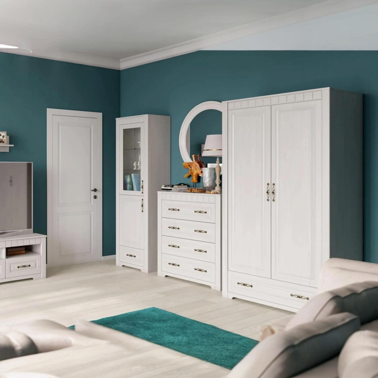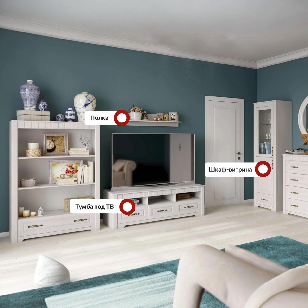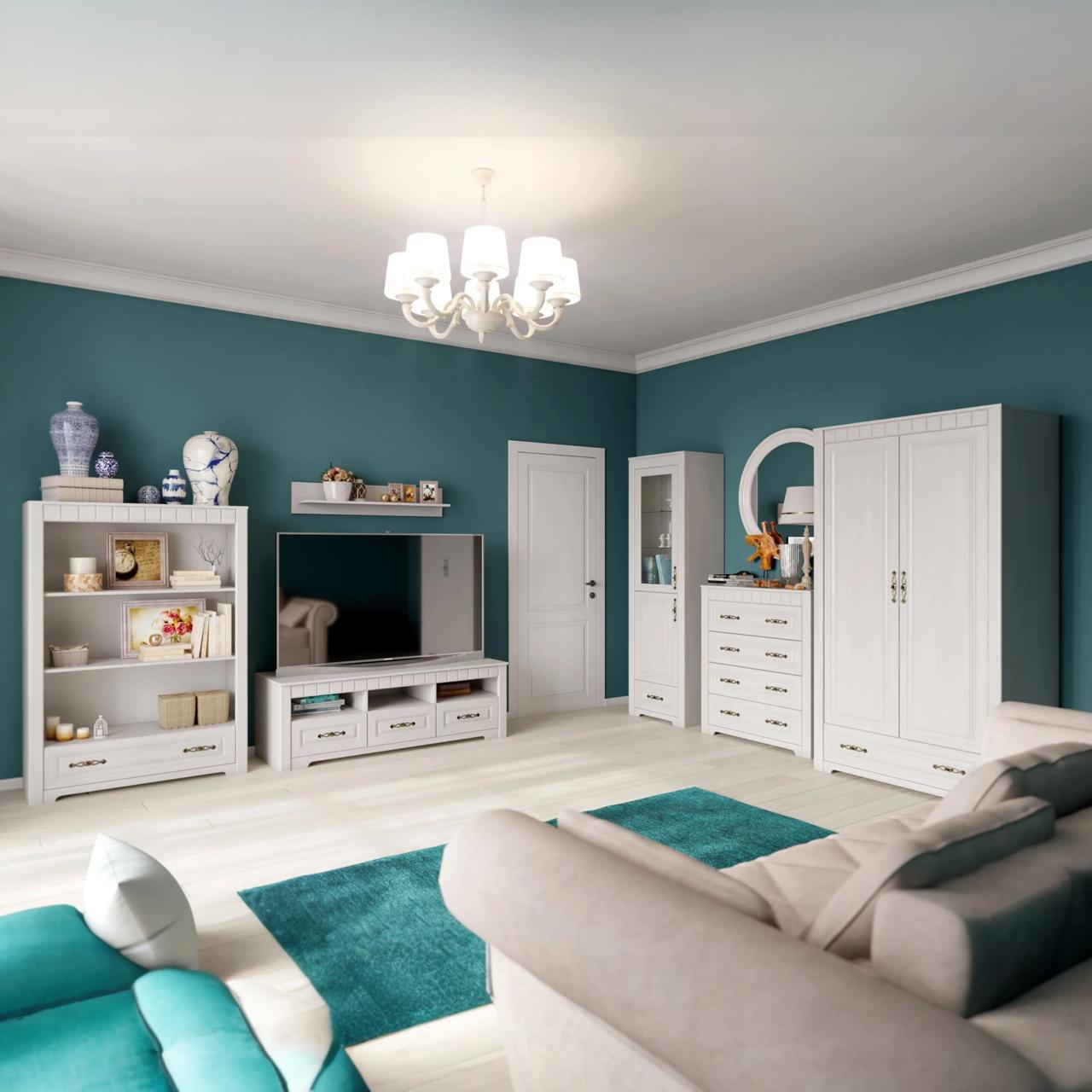 В серию "Прованс" входят: шкаф двухдверный, шкаф-витрина, стеллаж, комод, тумба под ТВ, полка навесная.