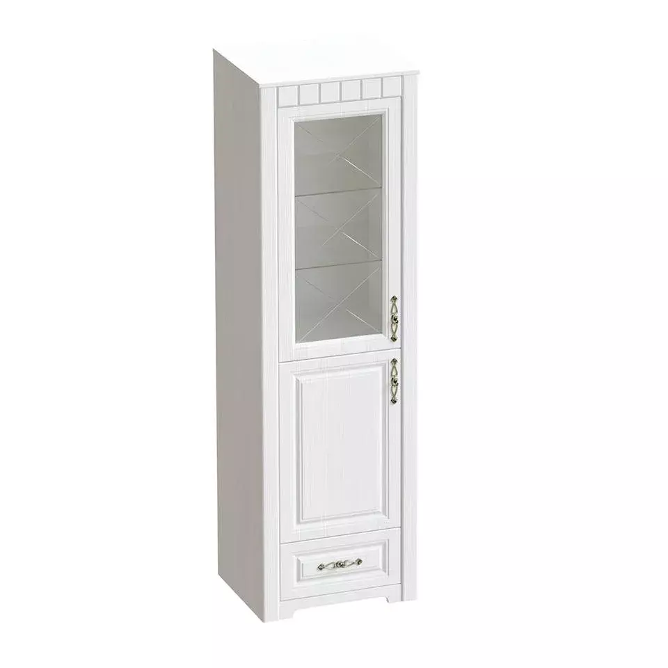 Рамочные фасады с фрезеровкой поддерживают романтичный стиль французской провинции, а ручки-кнопки придают мебели особое обаяние, свойственное прованскому стилю. Стекло шкафа-витрины декорировано алмазной гравировкой в виде ромбов.