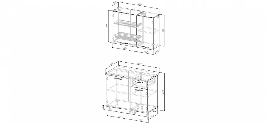 Модули первого верхнего яруса с фасадами со свесом 12 мм, что позволяет открывать их без установленных ручек.