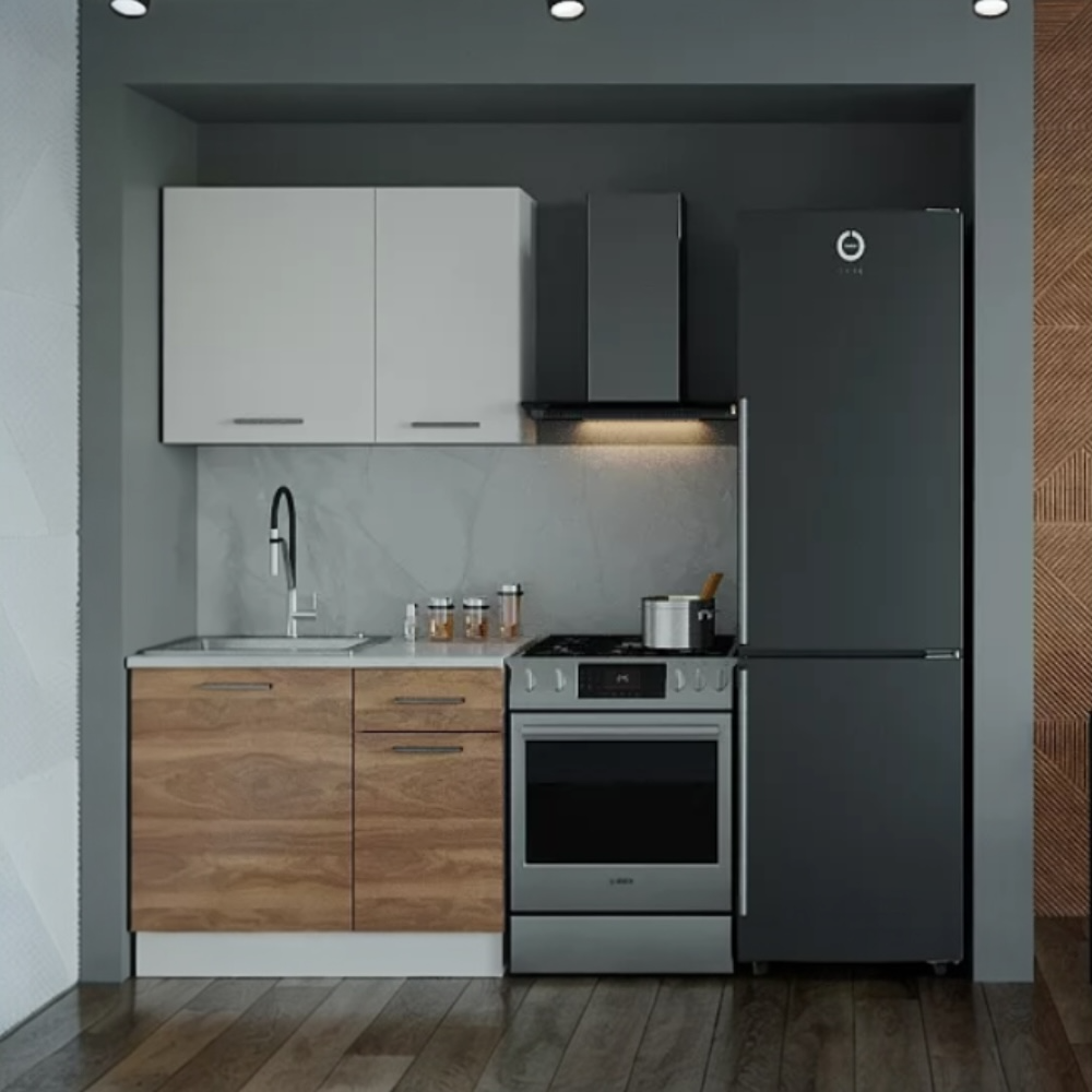 Модули первого верхнего яруса с фасадами со свесом 12 мм, что позволяет открывать их без установленных ручек.