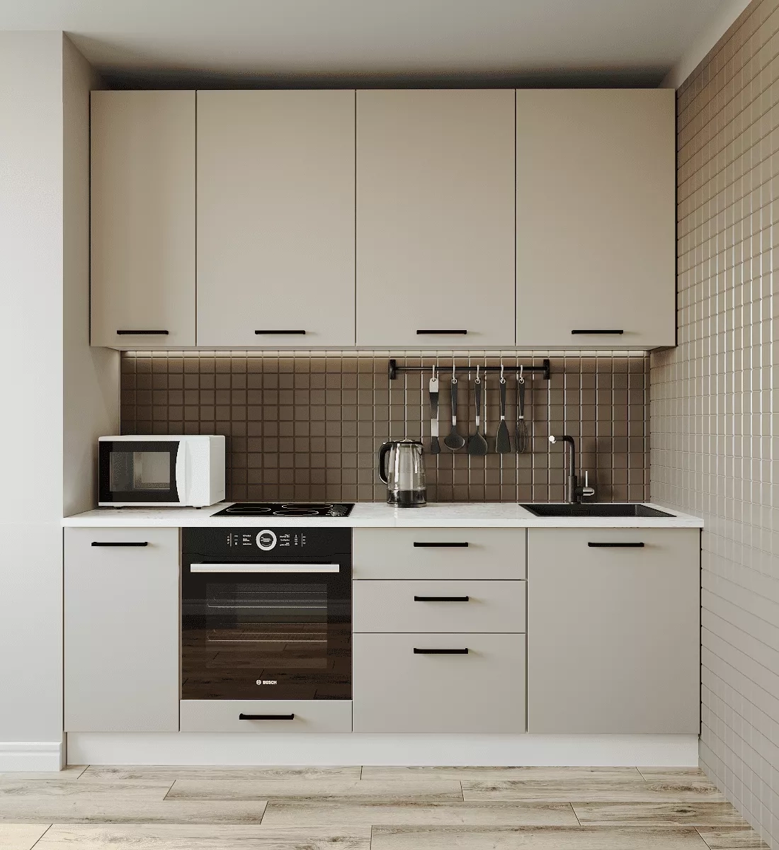 Фасады верхних модулей со свесом 12 мм дают возможность использовать без установки ручек.