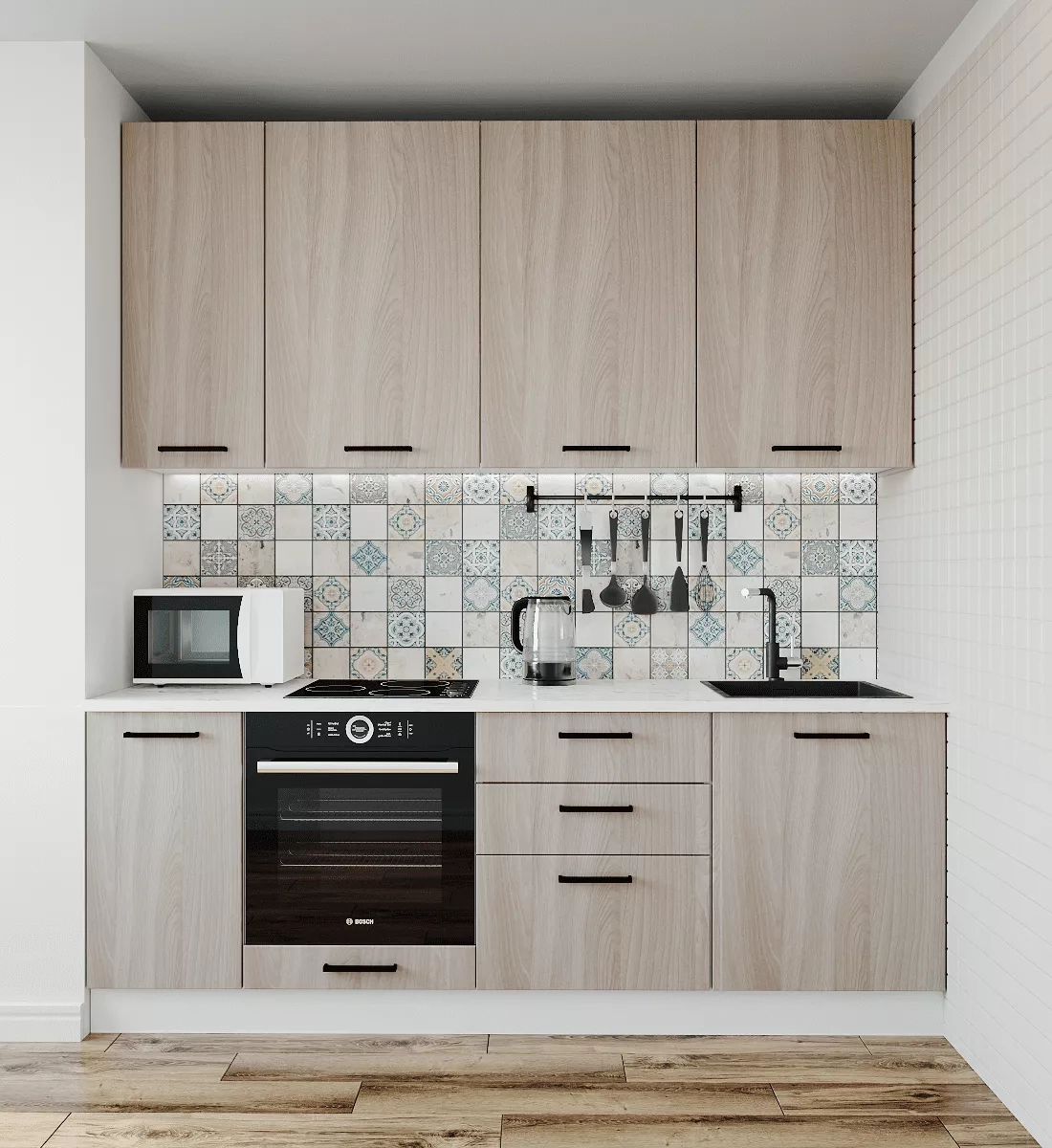 Фасады верхних модулей со свесом 12 мм дают возможность использовать без установки ручек.