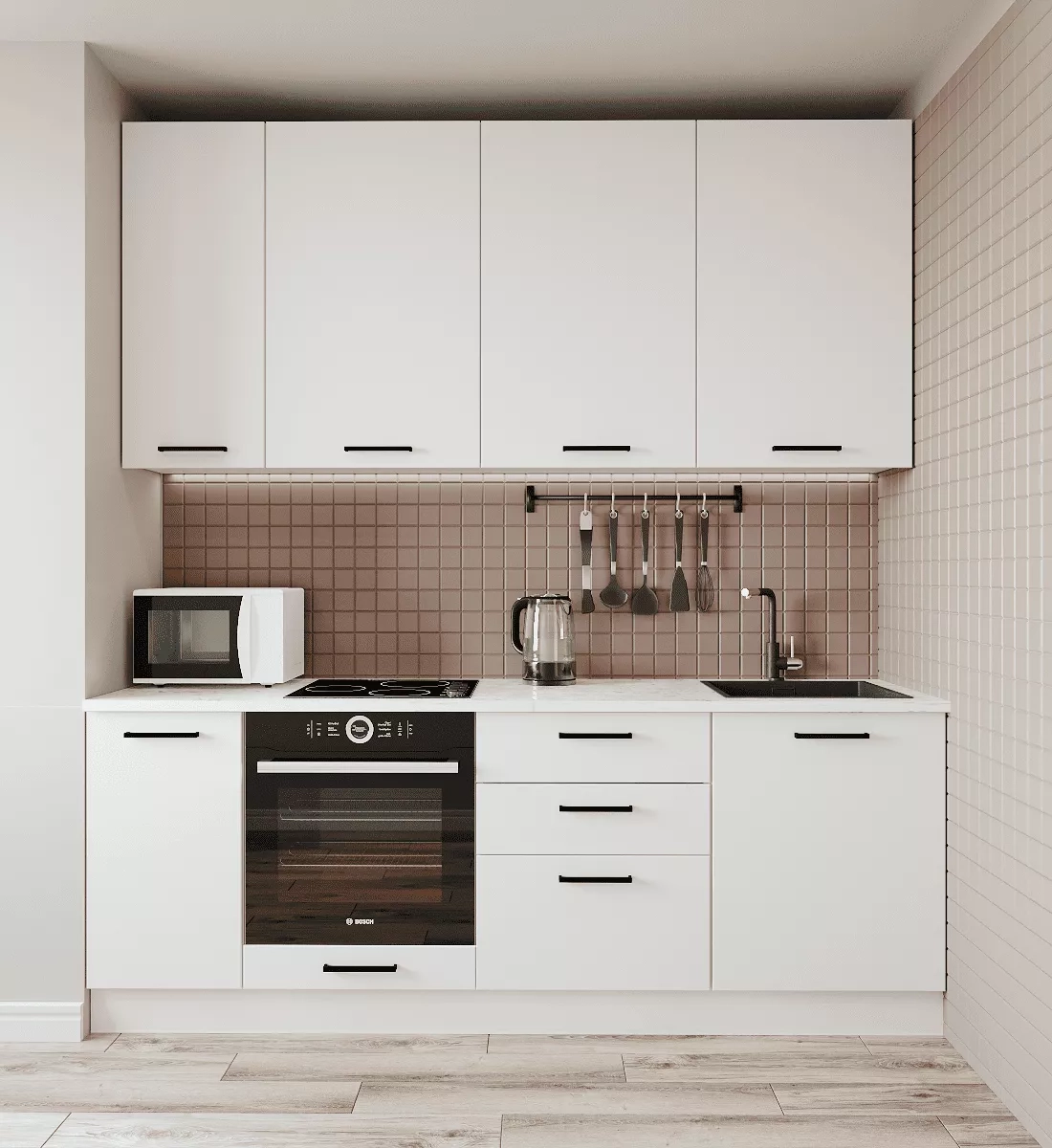 Фасады верхних модулей со свесом 12 мм дают возможность использовать без установки ручек.