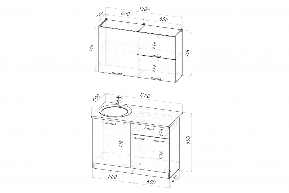 Мойка, смеситель, стеновая панель и посудосушитель в комплект гарнитура не входят.