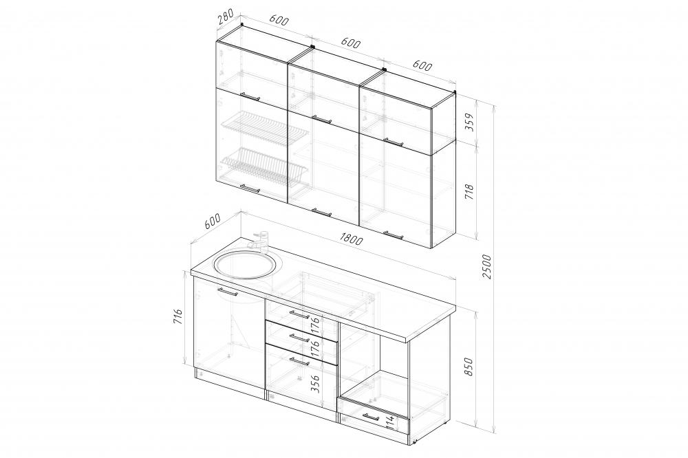 Мойка, смеситель, стеновая панель и посудосушитель в комплект гарнитура не входят.