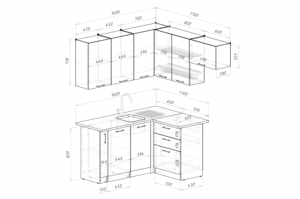 Мойка, смеситель, стеновая панель и посудосушитель в комплект гарнитура не входят.