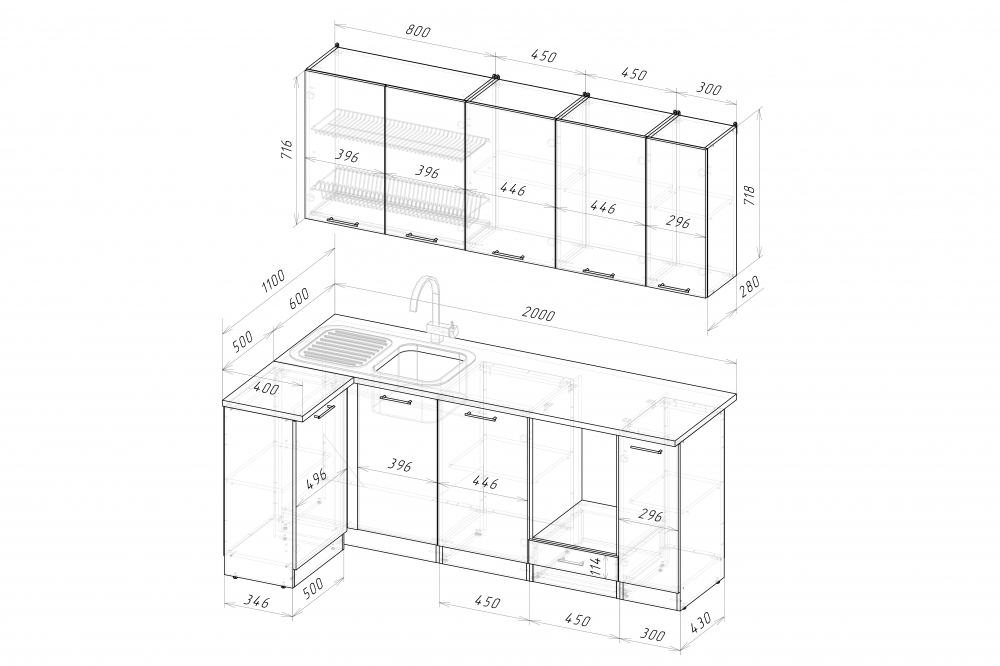 Мойка, смеситель, стеновая панель и посудосушитель в комплект гарнитура не входят.