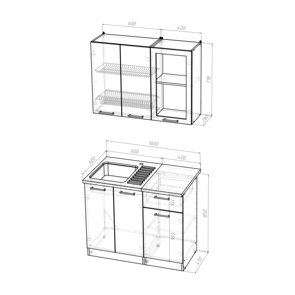 Мойка, смеситель, стеновая панель и посудосушитель в комплект гарнитура не входят.