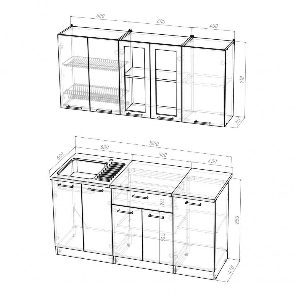 Мойка, смеситель, стеновая панель и посудосушитель в комплект гарнитура не входят.