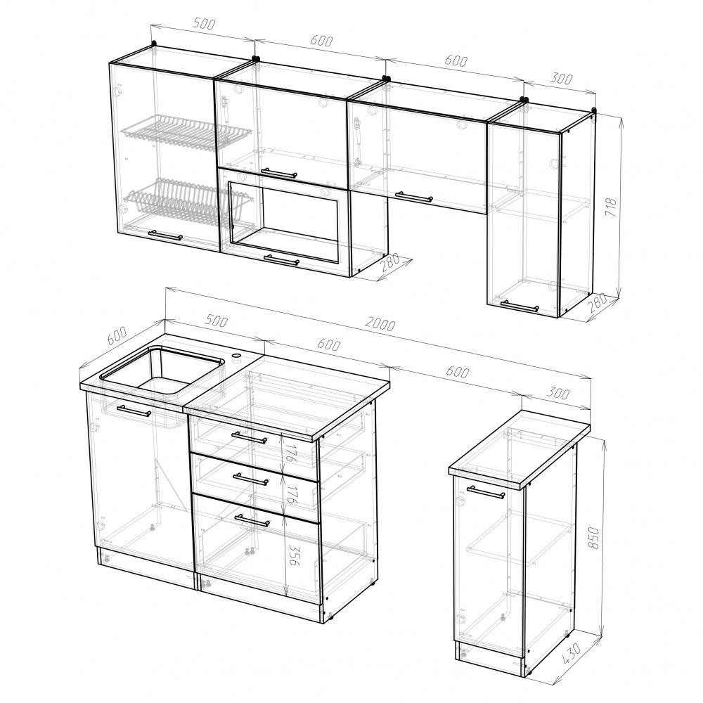 Мойка, смеситель, стеновая панель и посудосушитель в комплект гарнитура не входят.