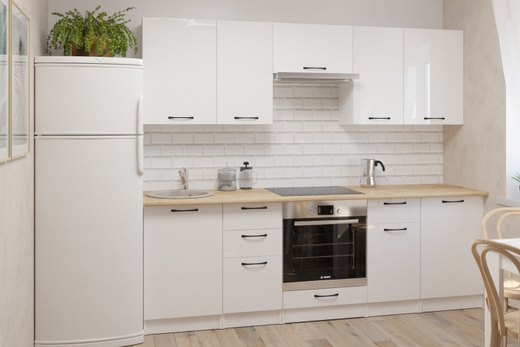 Прямые готовые кухни рациональны для маленьких квартир. При прямой планировке кухни важно предусмотреть место для холодильника и учесть его габариты. Если ваша кухня объединена с гостиной, или же настолько просторная, что позволяет сделать полноценную обеденную зону для большой семьи, то смело выбирайте линейную конфигурацию кухни.
