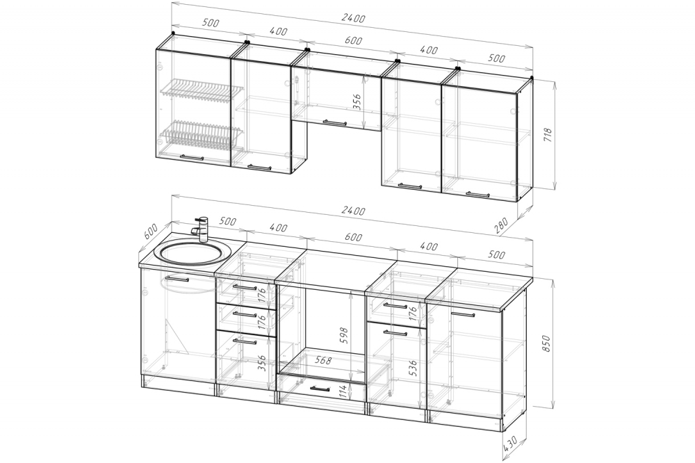 Мойка, смеситель, стеновая панель и посудосушитель в комплект гарнитура не входят.