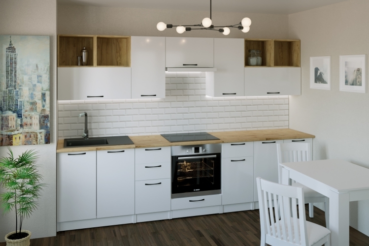 Прямые готовые кухни рациональны для маленьких квартир. При прямой планировке кухни важно предусмотреть место для холодильника и учесть его габариты. Если ваша кухня объединена с гостиной, или же настолько просторная, что позволяет сделать полноценную обеденную зону для большой семьи, то смело выбирайте линейную конфигурацию кухни.