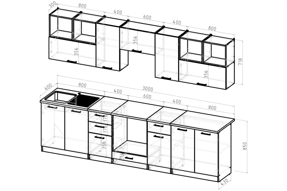 Мойка, смеситель, стеновая панель и посудосушитель в комплект гарнитура не входят.
