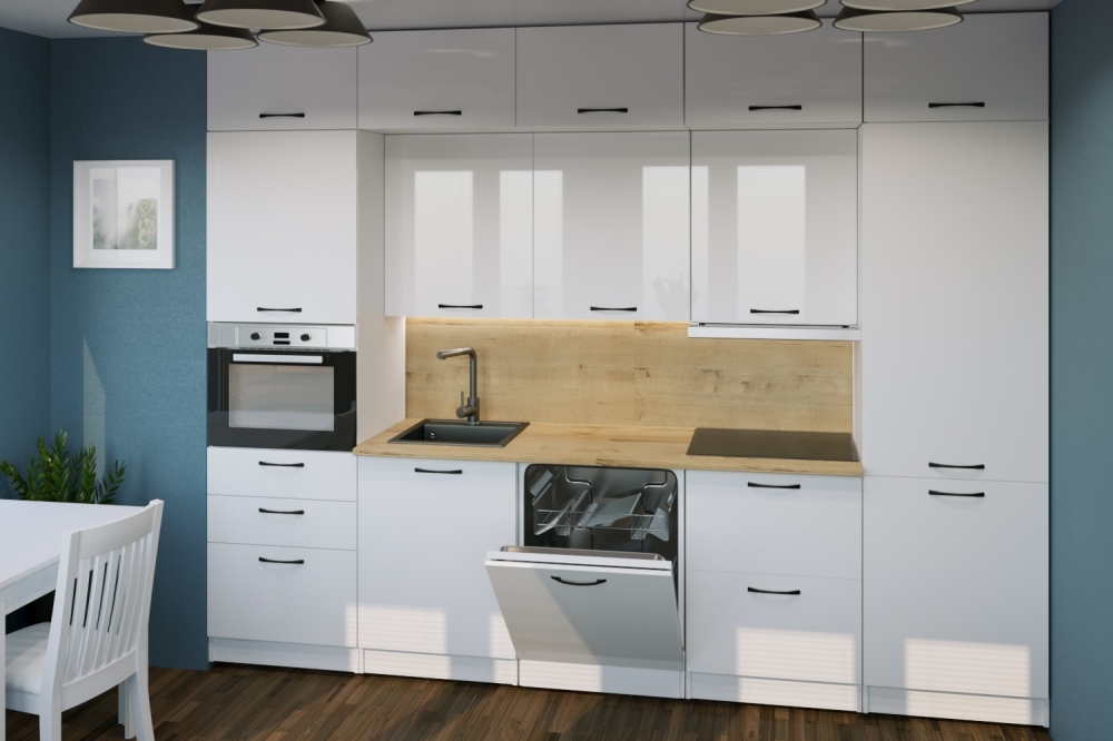 Прямые готовые кухни рациональны для маленьких квартир. При прямой планировке кухни важно предусмотреть место для холодильника и учесть его габариты. Если ваша кухня объединена с гостиной, или же настолько просторная, что позволяет сделать полноценную обеденную зону для большой семьи, то смело выбирайте линейную конфигурацию кухни.