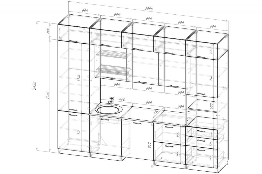 Мойка, смеситель, стеновая панель и посудосушитель в комплект гарнитура не входят.