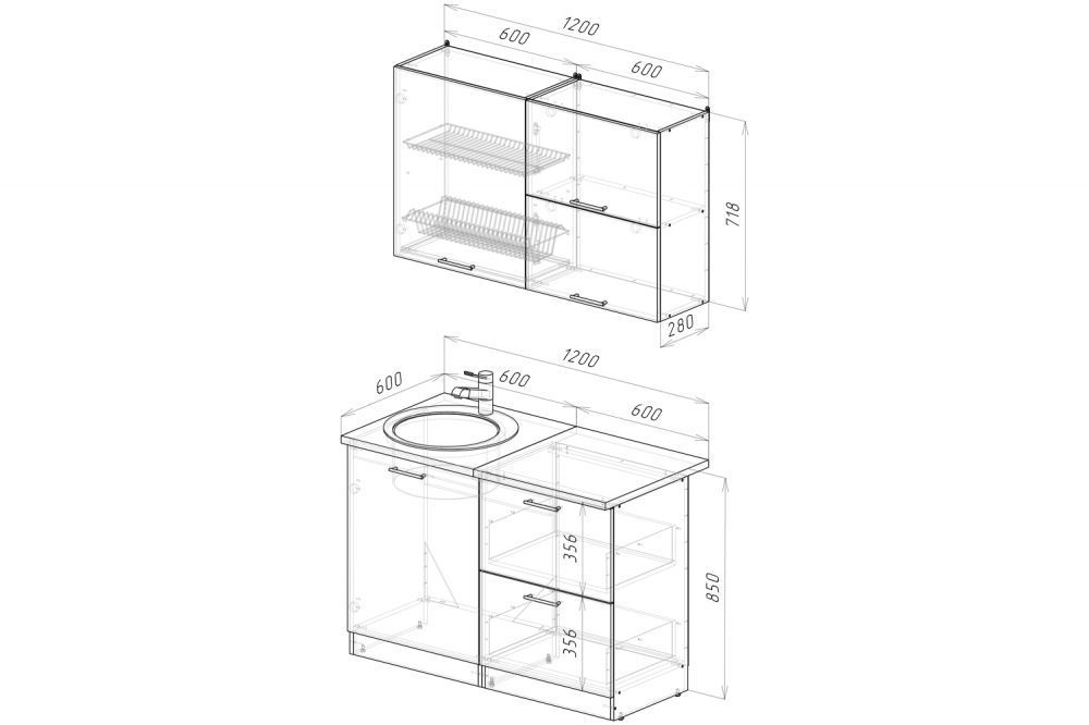 Мойка, смеситель, стеновая панель и посудосушитель в комплект гарнитура не входят.