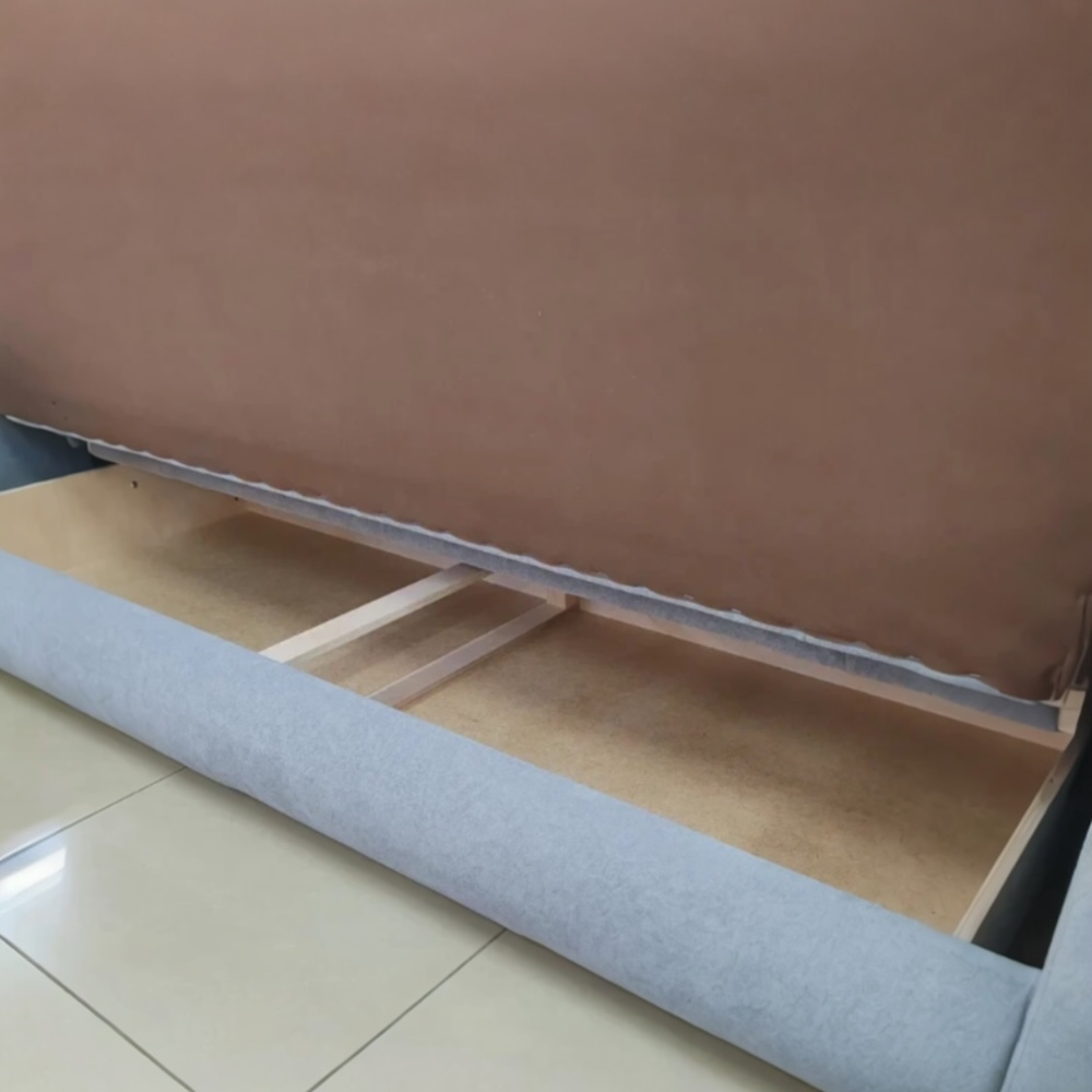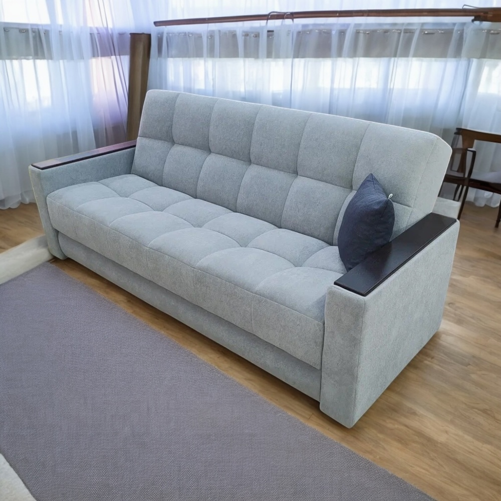 В основании спального места пружинный блок, термовойлок, ППУ высокой плотности, синтепон. Высокая спинка удобна для сидения, легкий доступ к вместительному коробу для постельных принадлежностей. Компактный и не дорогой диван.