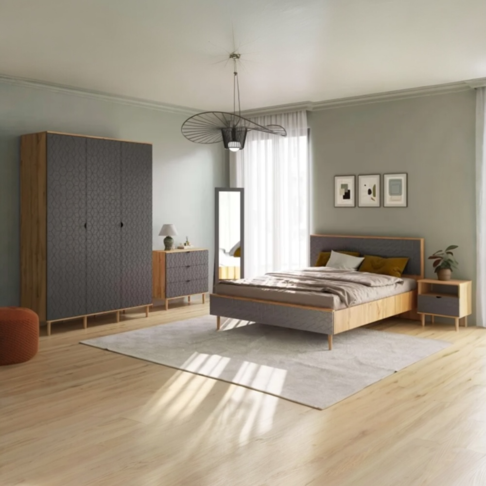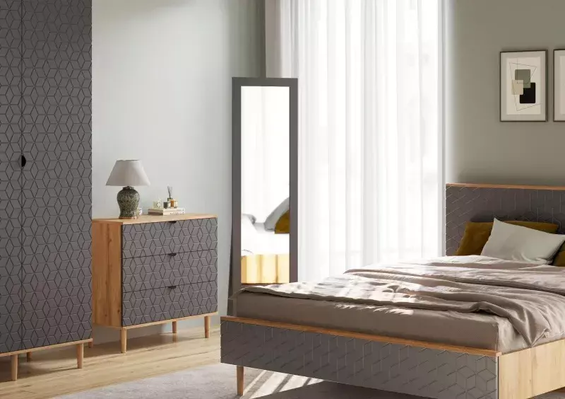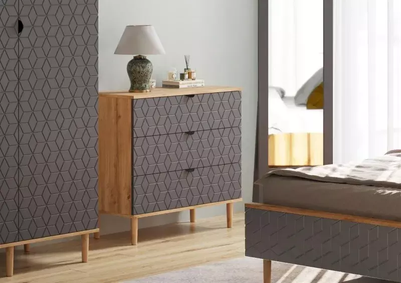 Спальный гарнитур "Денвер" - это изысканное и стильное решение для обустройства вашей спальни. Отличительной особенностью данной коллекции является изящная фрезеровка на фасадах в виде кубов, придающая им неповторимый шарм и элегантность.