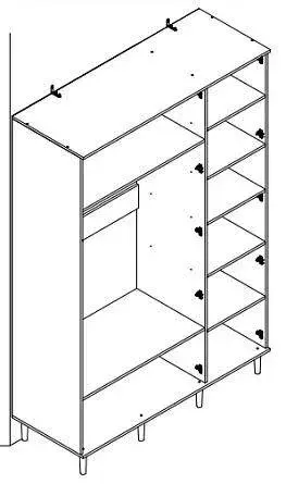 Внутреннее пространство шкафа разделено на два отделения: платяное, с двумя большими стационарными полками и продольной металлической штангой, и отделение с пятью стационарными полками.