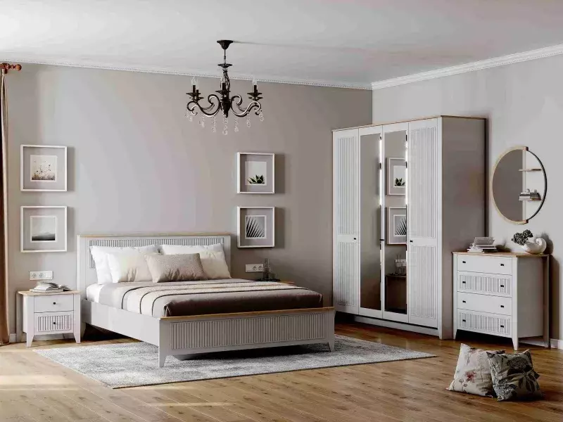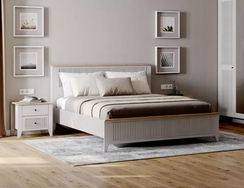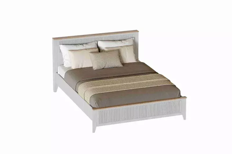Кровать Валенсия выполнена из ЛДСП в комбинации Дуб натуральный светлый/Персидский жемчуг.